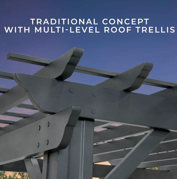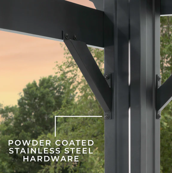 Traditional and timeless, the Stratford Steel Pergola by Backyard Discovery brings effortless charm to your outdoor living area. This stunning patio pergola combines enduring craftsmanship with modern sophistication, featuring a stylish black finish that creates a bold, striking aesthetic. Engineered with powder-coated galvanized steel, it delivers maintenance-free durability while providing superior protection against rust, chipping, corrosion, and UV damage. The elegant design provides plenty of shade with the integrated pergola canopy. This soft shade sail filters sunlight while offering protection from the elements, creating the ideal balance of shelter and ambiance. Pro-Tect™ tested and proven to withstand winds up to 100 mph*, this outdoor metal pergola stands strong through adverse weather conditions. Its generous size provides plenty of room for furniture, fire pits, and outdoor décor to create the perfect space for gatherings or simply relaxing. The patented PowerPort™ features three electrical outlets and three USB ports, making it easy to power your outdoor entertainment needs. This ready-to-assemble backyard pergola kit offers step-by-step guidance with the BILT® app, for easier installation.