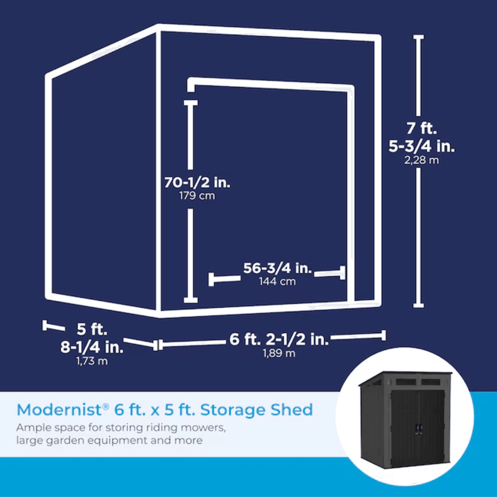 Organize and protect your outdoor essentials with the Suncast 6′ x 5′ Modernist® Storage Shed — a durable, secure, and stylish solution for your backyard!