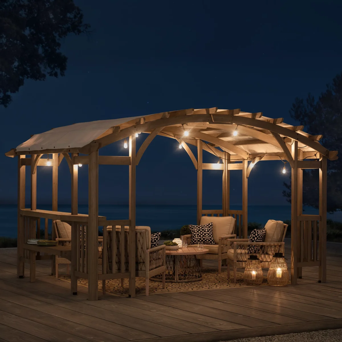 Wish you could entertain friends outdoors more comfortably? The Sunjoy Bellucci 10 ft. x 14 ft. arched cedar pergola with a weather-resistant light grey canopy offers the perfect shaded retreat for sunny days. Its elegant arched design, premium cedar wood frame, and built-in shelves create a stylish and functional outdoor oasis for gatherings, relaxation, or dining al fresco.